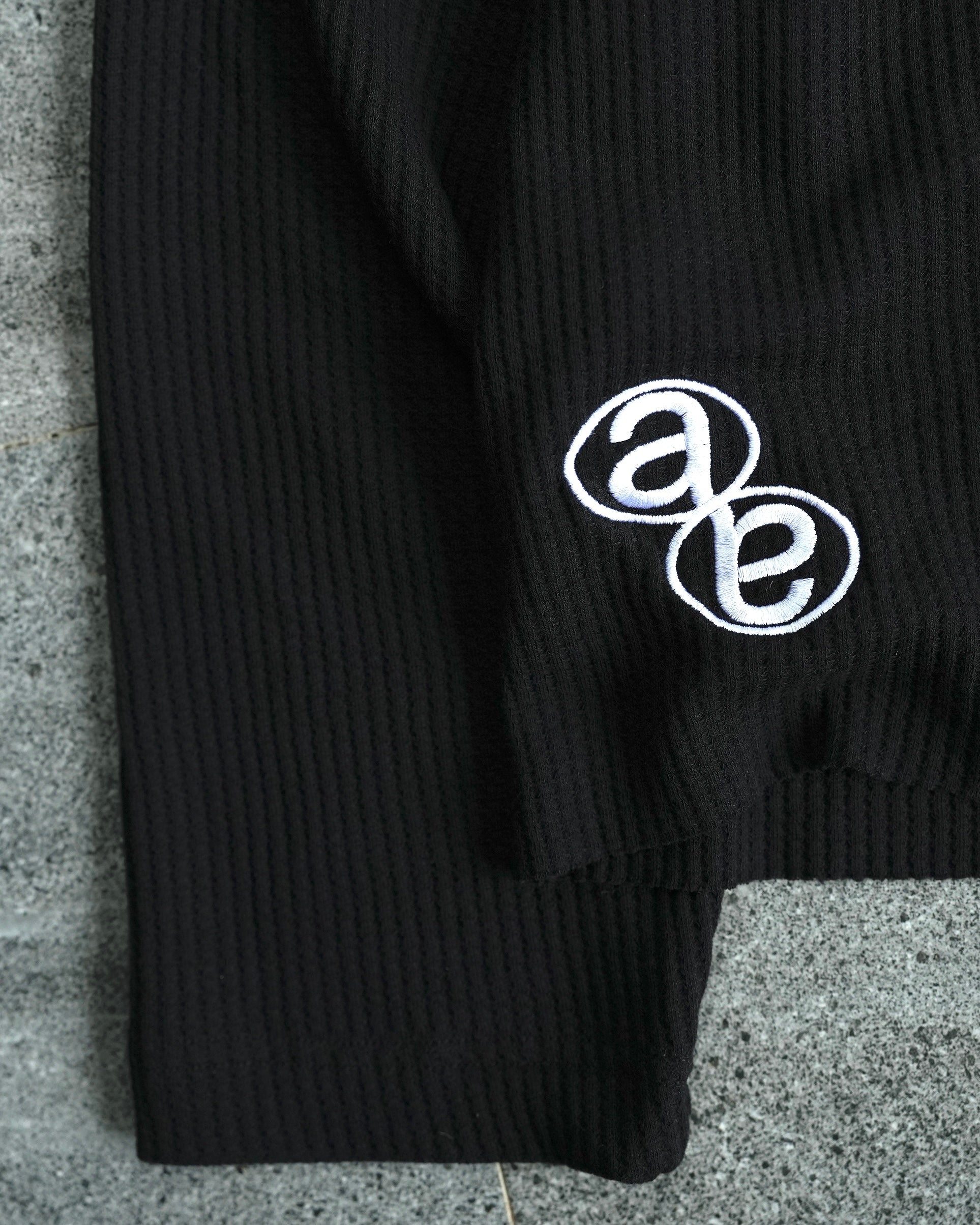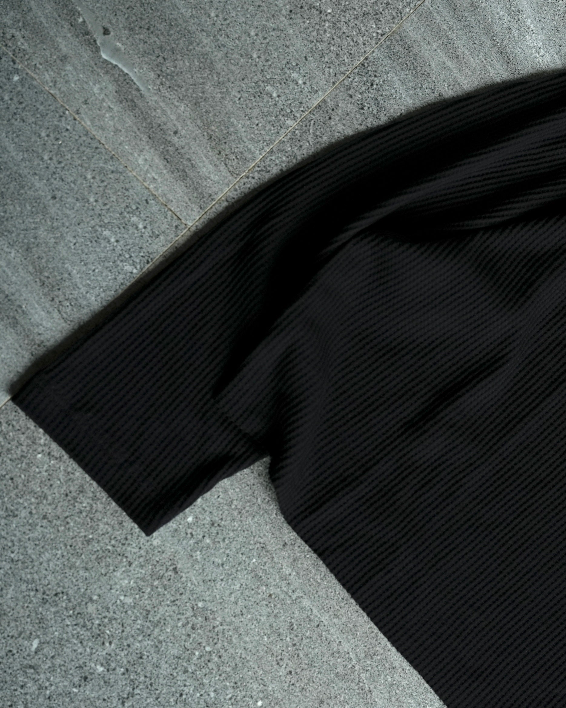 Lightweight waffle-knit cotton. Raw hem. Reinforced collars. Dropped shoulders, relaxed cut. Made for transitional weather.
