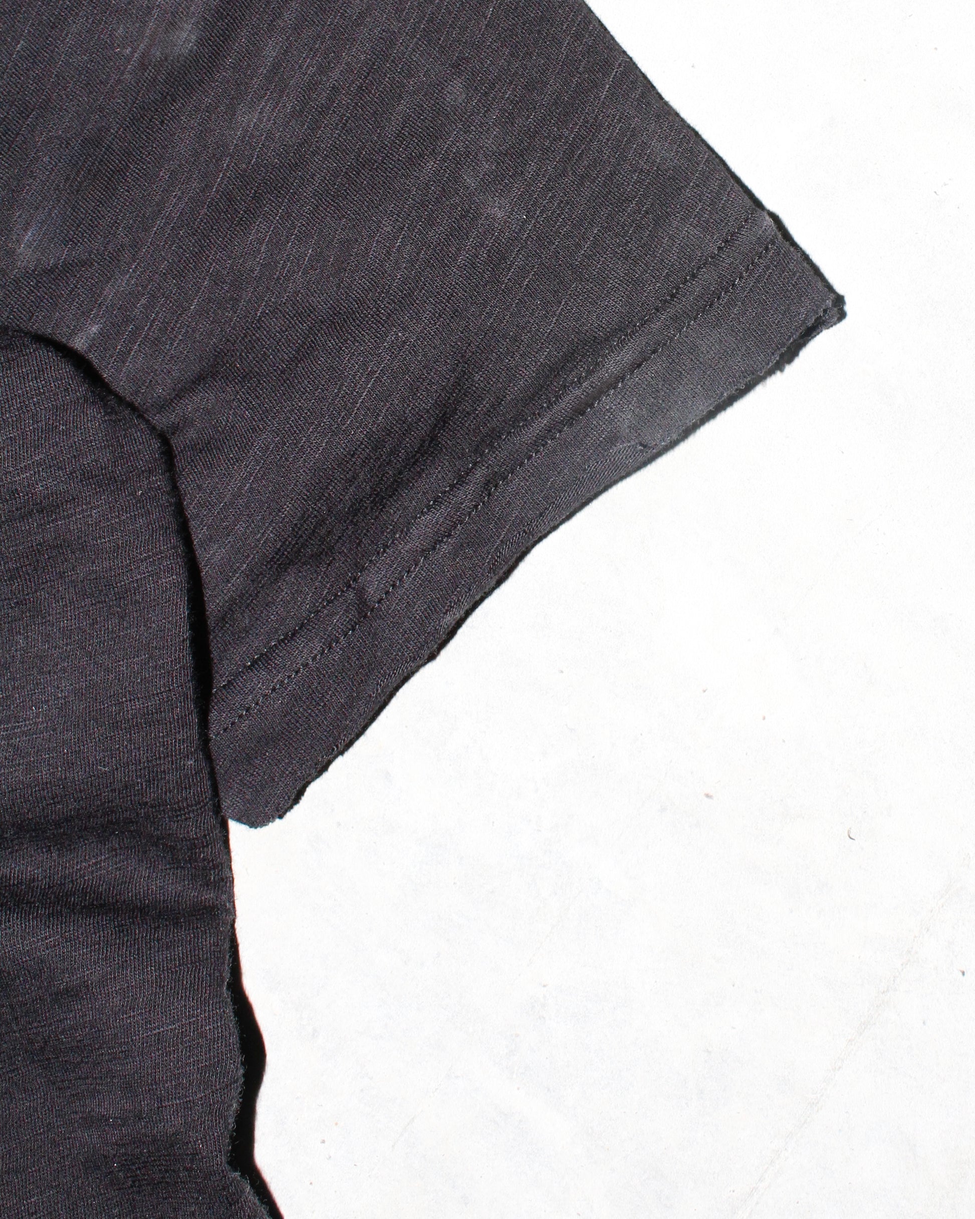 100% organic slub cotton. All-over distressing. Slant shoulders, cropped fit. Made to last (and comes with a cute print).